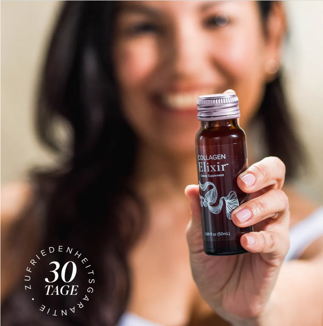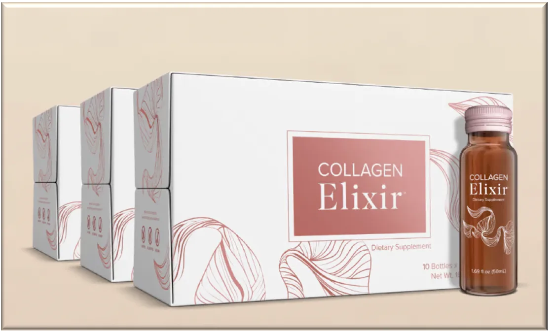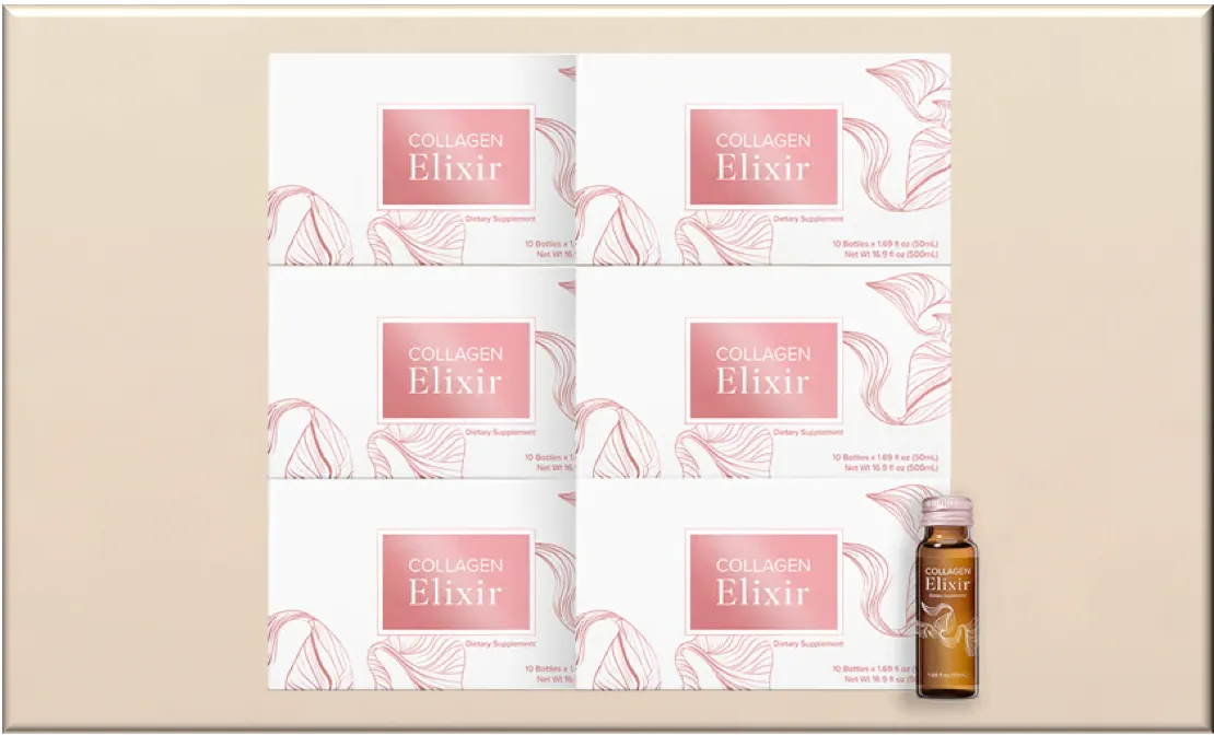 Collagen Elixir™ ist der neueste Baustein in Deiner Beauty-Routine. Es wird mit 5 gramm Meereskollagen-Peptiden, Biotin, Vitamin C, Zink sowie anderen althergebrachten Pflanzenstoffen hergestellt und unterstützt eine gesunde Haut von innen heraus*. Alles was Du noch tun musst ist Schluck für Schluck genießen.